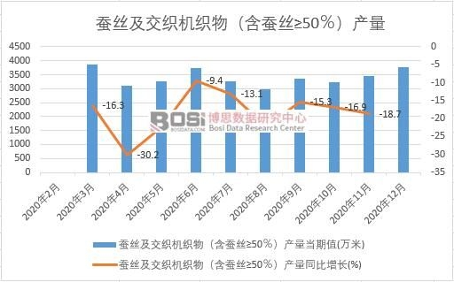 導讀: 據博思數據發布的《2021-2027年中國蠶絲市場深度調研與投資前景研究報告》表明:2020年我國蠶絲及交織機織物(含蠶絲≥50%)產量累計值達38349.5萬米,期末產量比上年累計下降18.3%。
